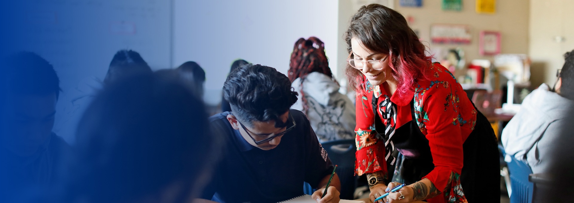 teacher in classroom helping a student at their desk