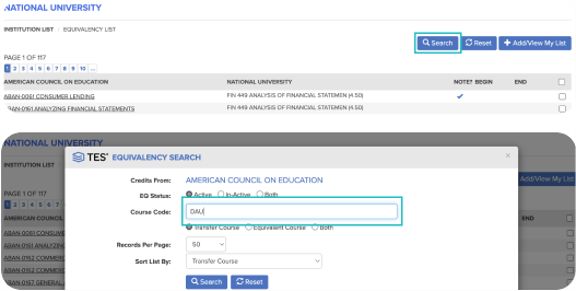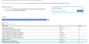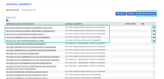 Select one or more courses with the checkbox, then click “Add/View My List” to see transfer details.